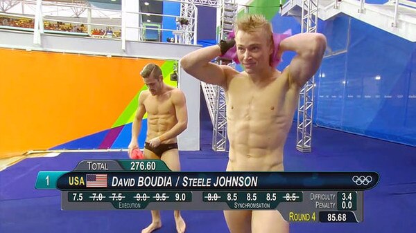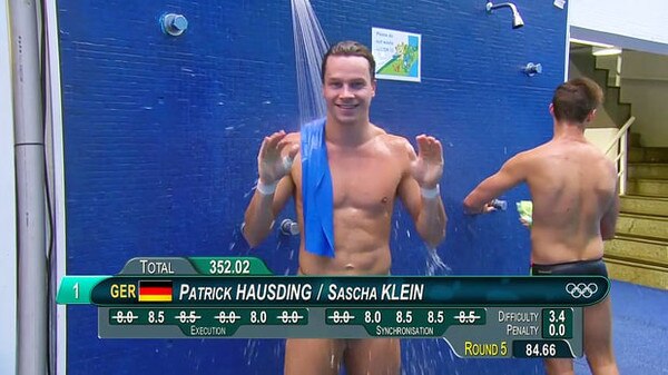 Se trata de la "censura accidental" que se está dando durante las transmisiones de las competencias de natación masculina cuando la barra de información cubre exactamente el parte inferior de los deportistas y da la ilusión de que están completamente desnudos, lo que resulta bastante sexy para todo el mundo.